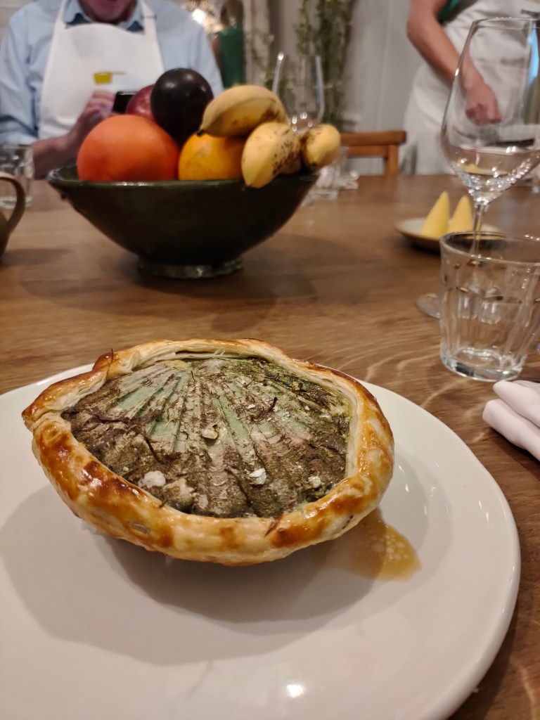 It took me more than twice as long as Roux to tease the scallops open, and I struggled to slice them properly. My pastry seal around the shell was a bodge job, and beyond the forgotten egg wash, I should have sprinkled more sugar on my choux pastry. Mistakes aside, it was still delicious, and Roux was incredibly helpful and engaging, and even served us bread before we tucked in.
