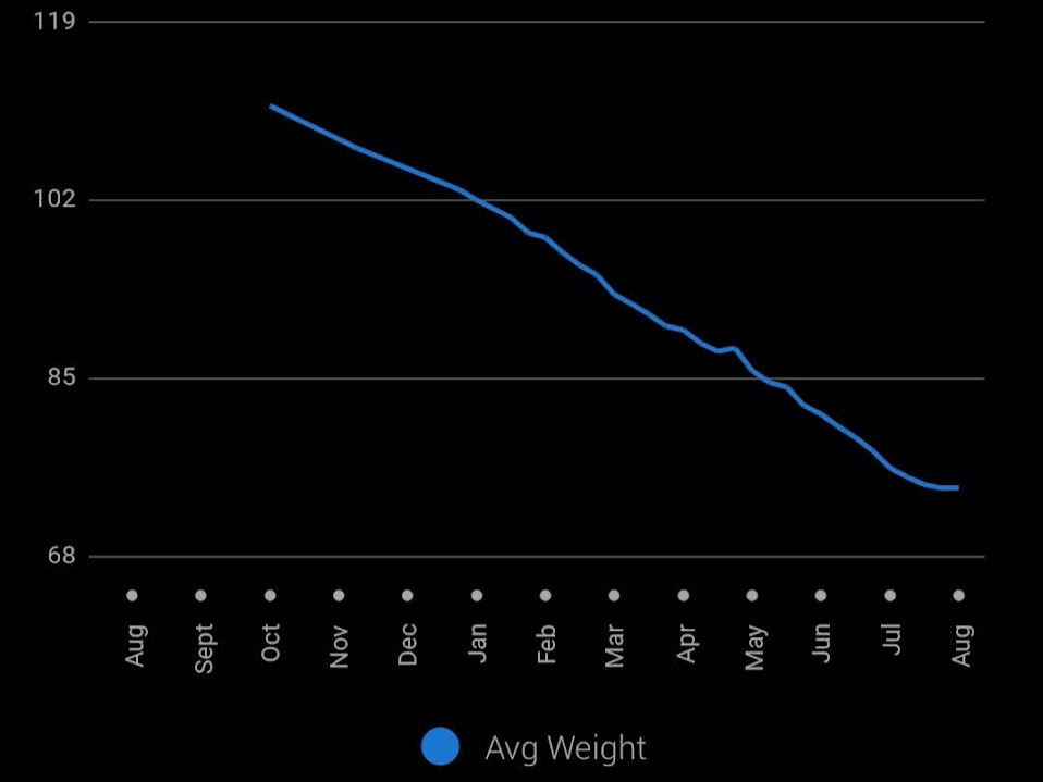 Now, there are a few fluctuations here and there. I remember losing something crazy like a couple of kilograms in the first week alone, which was purely due to losing the initial water weight. But in general, sticking to the plan, and recalculating the numbers above every 5kg lost or so (the less you weigh, the less calories you need), kept me on track.
